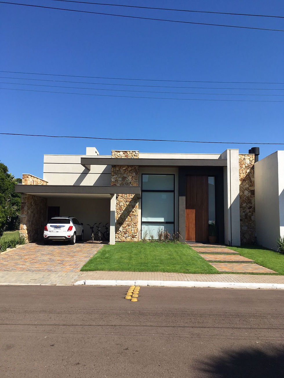Localizado no litoral, no condomínio Velas da Marina em Capão da Canoa, casa térrea de 225m², área gourmet integrada no pé direito duplo, escritório, 3 suítes e jardim de inverno. Fachada que tira proveito da largura do lote, com acesso principal demarcado com pórtico, vidro central em evidência iluminando o pé direito duplo, detalhes em frisos e lajes vazadas.